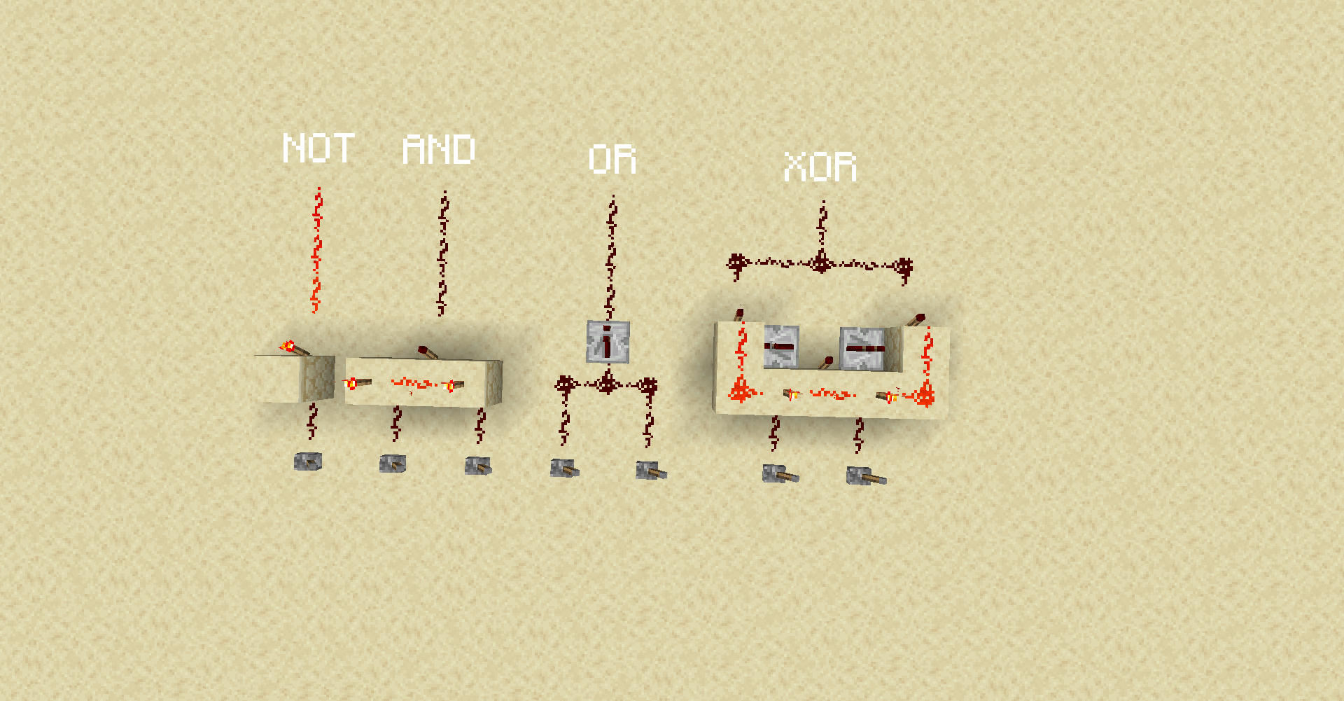 COMPUTADOR de REDSTONE no MINECRAFT. A porta NOT [NÃO (!))] inverte o estado, ligado vira desligado e vice-versa. Já as portas OR [OU (| |)], AND [E (&&)] e XOR